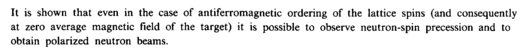 It is shown that even in the case of antiferromagnetic ordering of the lattice spins (and consequently at zero average magnetic field of the target) it is possible to observe neutron-spin precession and to obtain polarized neutron beams.