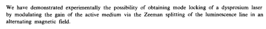 We have demonstrated experimentally the possibility of obtaining mode locking of a dysprosium laser by modulating the gain of the active medium via the Zeeman splitting of the luminescence line in an alternating magnetic field.