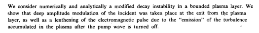 We consider numerically and analytically a modified decay instability in a bounded plasma layer. We show that deep amplitude modulation of the incident was taken place at the exit from the plasma layer, as well as a lenthening of the electromagnetic pulse due to the "emission" of the turbulence accumulated in the plasma after the pump wave is turned off.