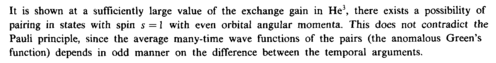 It is shown at a sufficiently large value of the exchange gain in He3, there exists a possibility of pairing in states with spin s = 1 with even orbital angular momenta. This does not contradict the Pauli principle, since the average many-time wave functions of the pairs (the anomalous Green's function) depends in odd manner on the difference between the temporal arguments.