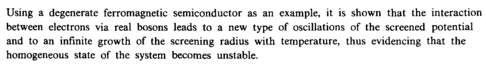 Using a degenerate ferromagnetic semiconductor as an example, it is shown that the interaction between electrons via real bosons leads to a new type of oscillations of the screened potential and to an infinite growth of the screening radius with temperature, thus evidencing that the homogeneous state of the system becomes unstable.