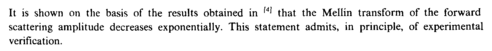 It is shown on the basis of the results obtained in '4' that the Mellin transform of the forward scattering amplitude decreases exponentially. This statement admits, in principle, of experimental verification.