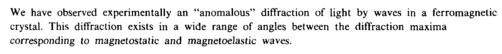 We have observed experimentally an "anomalous" diffraction of light by waves in a ferromagnetic crystal. This diffraction exists in a wide range of angles between the diffraction maxima corresponding to magnetostatic and magnetoelastic waves.