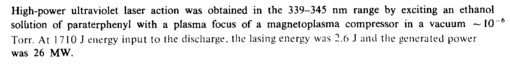 High-power ultraviolet laser action was obtained in the 339-345 nm range by exciting an ethanol solution of paraterphenyl with a plasma focus of a magnetoplasma compressor in a vacuum —10 Torr. At 1 710 J energy input to the discharge, the lasing energy was 2.6 J and the generated power was 26 MW.