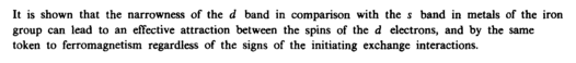It is shown that the narrowness of the d band in comparison with the s band in metals of the iron group can lead to an effective attraction between the spins of the d electrons, and by the same token to ferromagnetism regardless of the signs of the initiating exchange interactions.
