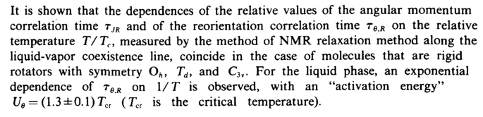 It is shown that the dependences of the relative values of the angular momentum correlation time tjr and of the reorientation correlation time τθ R on the relative temperature T/Tc, measured by the method of NMR relaxation method along the liquid-vapor coexistence line, coincide in the case of molecules that are rigid rotators with symmetry Ofc, Td, and C3„. For the liquid phase, an exponential dependence of reR on l/T is observed, with an "activation energy" ç7Å = (1.3±0.1)çÓÇ (çÓÇ is the critical temperature).