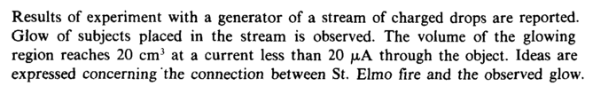 Results of experiment with a generator of a stream of charged drops are reported. Glow of subjects placed in the stream is observed. The volume of the glowing region reaches 20 cm3 at a current less than 20 μΑ through the object. Ideas are expressed concerning the connection between St. Elmo fire and the observed glow.