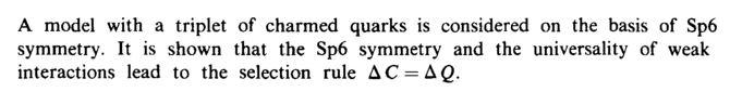 A model with a triplet of charmed quarks is considered on the basis of Sp6 symmetry. It is shown that the Sp6 symmetry and the universality of weak interactions lead to the selection rule AC = AQ.