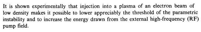 It is shown experimentally that injection into a plasma of an electron beam of low density makes it possible to lower appreciably the threshold of the parametric instability and to increase the energy drawn from the external high-frequency (RF) pump field.