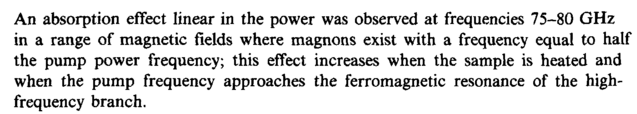 An absorption effect linear in the power was observed at frequencies 75-80 GHz in a range of magnetic fields where magnons exist with a frequency equal to half the pump power frequency; this effect increases when the sample is heated and when the pump frequency approaches the ferromagnetic resonance of the high-frequency branch.
