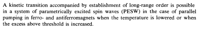 A kinetic transition accompanied by establishment of long-range order is possible in a system of parametrically excited spin waves (PESW) in the case of parallel pumping in ferroand antiferromagnets when the temperature is lowered or when the excess above threshold is increased.