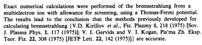 Exact numerical calculations were performed of the bremsstrahlung from a multielectron ion with allowance for screening, using a Thomas-Fermi potential. The results lead to the conclusion that the methods previously developed for calculating bremsstrahlung {V.D. Kirillov et ah, Fiz. Plazmy 1, 218 (1975) [Sov. J. Plasma Phys. 1, 117 (1975)]; V. I. Gervids and V. I. Kogan, Pis'ma Zh. Eksp. Teor. Fiz. 22, 308 (1975) [JETP Lett. 22, 142 (1975)] j are accurate.