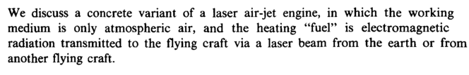 We discuss a concrete variant of a laser air-jet engine, in which the working medium is only atmospheric air, and the heating "fuel" is electromagnetic radiation transmitted to the flying craft via a laser beam from the earth or from another flying craft.