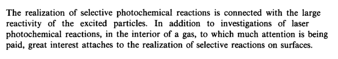 The realization of selective photochemical reactions is connected with the large reactivity of the excited particles. In addition to investigations of laser photochemical reactions, in the interior of a gas, to which much attention is being paid, great interest attaches to the realization of selective reactions on surfaces.
