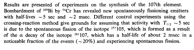 Results are presented of experiments on the synthesis of the 107th element. Bombardment of 209Bi by S4Cr has revealed new spontaneously fissioning emitters with half-lives ~5 sec and ~2 msec. Different control experiments using the crossing-reaction method give grounds for assuming that activity with Tm ~5 sec is due to the spontaneous fission of the isotope 257 1 05, which is formed as a result of the α decay of the isotope 261107, which has a half-life of about 2 msec in a noticeable fraction of the events (~20%) and experiencing spontaenous fission.