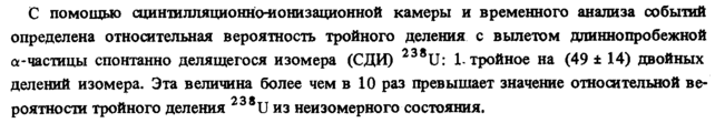 С помощью сцинтилляционно-ионизациоиной камеры и временного анализа событий определена относительная вероятность тройного деления с вылетом длиннопробежной α-частицы спонтанно делящегося изомера (СДИ) U: 1-тройное на (49 ±14) двойных делений изомера. Эта величина более чем в 10 раз превышает значение относительной ве-роятноста тройного деления U из неизомерного состояния.