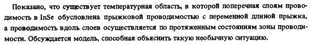Показано, что существует температурная область, в которой поперечная слоям проводимость в InSe обусловлена прыжковой проводимостью с переменной длиной прыжка, а проводимость вдоль слоев осуществляется по протяженным состояниям зоны проводимости. Обсуждается модель, способная объяснить такую необычную ситуацию.