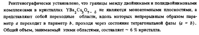 Рентгенографически установлено, что границы между двойниками и полидвойниковыми комплексами в кристаллах YBa2Cu^07_ δ не являются моноатомными плоскостями, а представляют собой переходные области, вдоль которых непрерывным образом параметр а переходит в параметр 6, проходя через состояние тетрагональной фазы {а ~ Ь). Общий объем, занимаемый этими областями, составляет ~ 6 % кристалла.