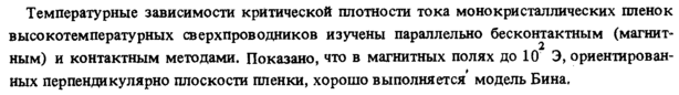 Температурные зависимости критической плотности тока мо но кристаллических пленок высокотемпературных сверхпроводников изучены параллельно бесконтактным (магнитным) и контактным методами. Показано, что в магнитных полях до 10 Э, ориентированных перпендикулярно плоскости пленки, хорошо выполняется модель Бина,
