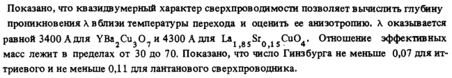 Показано, что квазидв у мерный характер сверхпроводимости позволяет вычислить глубину проникновения λ вблизи температуры перехода и оценить ее анизотропию, λ оказывается равной 3400 А для YBa Си 0_ и 4300 А для La fi.Sr ,-CuO.. Отношение эффективных масс лежит в пределах от 30 до 70. Показано, что число Гинзбурга не меньше 0,07 для ит-триевого и не меньше 0,11 для лантанового сверхпроводника.