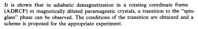 It is shown that in adiabatic demagnetization in a rotating coordinate frame (ADRCF) in magnetically diluted paramagnetic crystals, a transition to the "spin-glass" phase can be observed. The conditions of the transition are obtained and a scheme is proposed for the appropriate experiment.