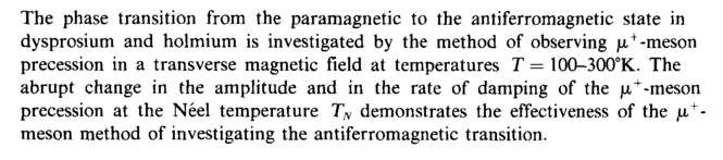 The phase transition from the paramagnetic to the antiferromagnetic state in dysprosium and holmium is investigated by the method of observing μ+-meson precession in a transverse magnetic field at temperatures Τ = 100-300°K. The abrupt change in the amplitude and in the rate of damping of the μ^ιηββοη precession at the Neel temperature TN demonstrates the effectiveness of the μ+-meson method of investigating the antiferromagnetic transition.