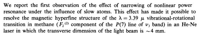 We report the first observation of the effect of narrowing of nonlinear power resonance under the influence of slow atoms. This effect has made it possible to resolve the magnetic hyperfine structure of the λ = 3.39 μ vibrational-rotational transition in methane (F2<2) component of the P(7) line of v3 band) in an He-Ne laser in which the transverse dimension of the light beam is —4 mm.