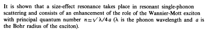 It is shown that a size-effect resonance takes place in resonant single-phonon scattering and consists of an enhancement of the role of the Wannier-Mott exciton with principal quantum number η =ϊ л/λ/4 α (λ is the phonon wavelength and a is the Bohr radius of the exciton).