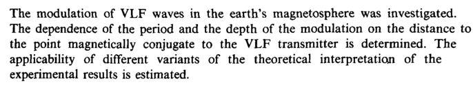 The modulation of VLF waves in the earth's magnetosphere was investigated. The dependence of the period and the depth of the modulation on the distance to the point magnetically conjugate to the VLF transmitter is determined. The applicability of different variants of the theoretical interpretation of the experimental results is estimated.