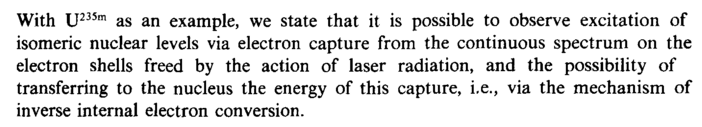 With U235m as an example, we state that it is possible to observe excitation of isomeric nuclear levels via electron capture from the continuous spectrum on the electron shells freed by the action of laser radiation, and the possibility of transferring to the nucleus the energy of this capture, i.e., via the mechanism of inverse internal electron conversion.