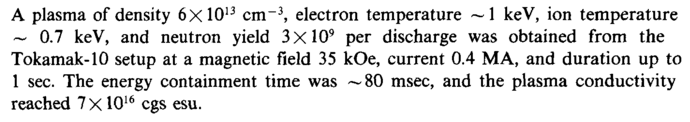 A plasma of density 6χ1013 cm-3, electron temperature ~1 keV, ion temperature ~ 0.7 keV, and neutron yield 3x10" per discharge was obtained from the Tokamak-10 setup at a magnetic field 35 kOe, current 0.4 MA, and duration up to 1 sec. The energy containment time was ~80 msec, and the plasma conductivity reached 7 χ 1016 cgs esu.