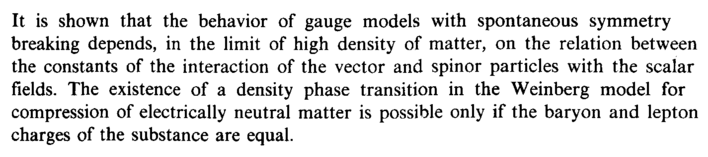 It is shown that the behavior of gauge models with spontaneous symmetry breaking depends, in the limit of high density of matter, on the relation between the constants of the interaction of the vector and spinor particles with the scalar fields. The existence of a density phase transition in the Weinberg model for compression of electrically neutral matter is possible only if the baryon and lepton charges of the substance are equal.