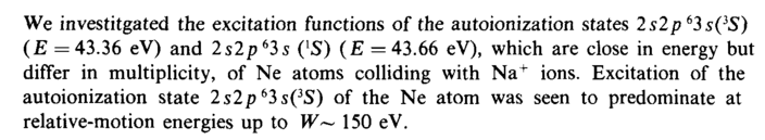 We investigated the excitation functions of the autoionization states 2s2p63s(3S) (E =43.36 eV) and 2s2p63s ([S) (E = 43.66 eV), which are close in energy but differ in multiplicity, of Ne atoms colliding with Na+ ions. Excitation of the autoionization state 2s2p63s(3S) of the Ne atom was seen to predominate at relative-motion energies up to W~ 150 eV.