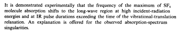 It is demonstrated experimentally that the frequency of the maximum of SF6 molecule absorption shifts to the long-wave region at high incident-radiation energies and at IR pulse durations exceeding the time of the vibrational-translation relaxation. An explanation is offered for the observed absorption-spectrum singularities.