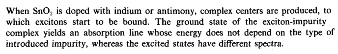When SnOz is doped with indium or antimony, complex centers are produced, to which excitons start to be bound. The ground state of the exciton-impurity complex yields an absorption line whose energy does not depend on the type of introduced impurity, whereas the excited states have different spectra.
