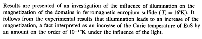 Results are presented of an investigation of the influence of illumination on the magnetization of the domains in ferromagnetic europium sulfide (Tc = 16°K). It follows from the experimental results that illumination leads to an increase of the magnetization, a fact interpreted as an increase of the Curie temperature of EuS by an amount on the order of 10 '°K under the influence of the light.