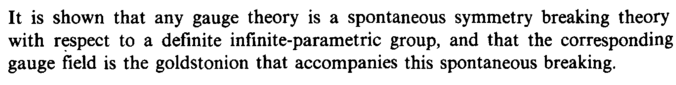 It is shown that any gauge theory is a spontaneous symmetry breaking theory with respect to a definite infinite-parametric group, and that the corresponding gauge field is the goldstonion that accompanies this spontaneous breaking.