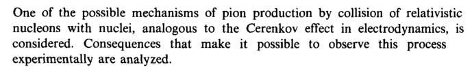 One of the possible mechanisms of pion production by collision of relativistic nucleons with nuclei, analogous to the Cerenkov effect in electrodynamics, is considered. Consequences that make it possible to observe this process experimentally are analyzed.