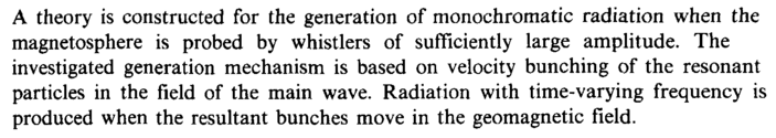 A theory is constructed for the generation of monochromatic radiation when the magnetosphere is probed by whistlers of sufficiently large amplitude. The investigated generation mechanism is based on velocity bunching of the resonant particles in the field of the main wave. Radiation with time-varying frequency is produced when the resultant bunches move in the geomagnetic field.