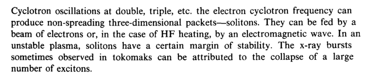 Cyclotron oscillations at double, triple, etc. the electron cyclotron frequency can produce non-spreading three-dimensional packets—solitons. They can be fed by a beam of electrons or, in the case of HF heating, by an electromagnetic wave. In an unstable plasma, solitons have a certain margin of stability. The x-ray bursts sometimes observed in tokomaks can be attributed to the collapse of a large number of excitons.