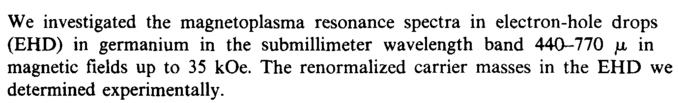 We investigated the magnetoplasma resonance spectra in electron-hole drops (EHD) in germanium in the submillimeter wavelength band 440-770 μ in magnetic fields up to 35 kOe. The renormalized carrier masses in the EHD we determined experimentally.