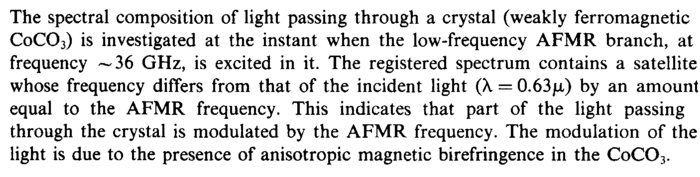 The spectral composition of light passing through a crystal (weakly ferromagnetic C0CO3) is investigated at the instant when the low-frequency AFMR branch, at frequency ~36 GHz, is excited in it. The registered spectrum contains a satellite whose frequency differs from that of the incident light (λ = 0.63μ) by an amount equal to the AFMR frequency. This indicates that part of the light passing through the crystal is modulated by the AFMR frequency. The modulation of the light is due to the presence of anisotropic magnetic birefringence in the C0CO3.