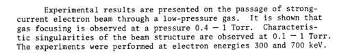 Experimental results are presented on the passage of strong-current electron beam through a low-pressure gas. It is shown that gas focusing is observed at a pressure 0.4 — 1 Torr. Characteristic singularities of the beam structure are observed at 0.1 — 1 Torr. The experiments were performed at electron energies 300 and 700 keV.