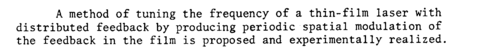 A method of tuning the frequency of a thin-film laser with distributed feedback by producing periodic spatial modulation of the feedback in the film is proposed and experimentally realized.