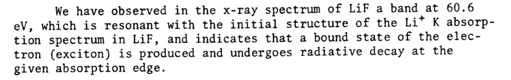 We have observed in the x-ray spectrum of LiF a band at 60.6 eV, which is resonant with the initial structure of the Li+ К absorption spectrum in LiF, and indicates that a bound state of the electron (exciton) is produced and undergoes radiative decay at the given absorption edge.