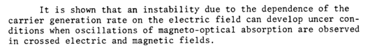 It is shown that an instability due to the dependence of the carrier generation rate on the electric field can develop uncer conditions when oscillations of magneto-optical absorption are observed in crossed electric and magnetic fields.