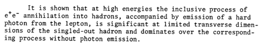 It is shown that at high energies the inclusive process of e e" annihilation into hadrons, accompanied by emission of a hard photon from the lepton, is significant at limited transverse dimensions of the singled-out hadron and dominates over the corresponding process without photon emission.