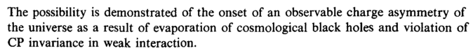 The possibility is demonstrated of the onset of an observable charge asymmetry of the universe as a result of evaporation of cosmological black holes and violation of CP invariance in weak interaction.