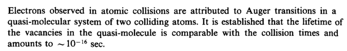 Electrons observed in atomic collisions are attributed to Auger transitions in a quasi-molecular system of two colliding atoms. It is established that the lifetime of the vacancies in the quasi-molecule is comparable with the collision times and amounts to ~ 10-16 sec.