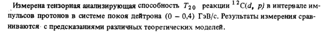 Измерена тензорная анализирующая способность T2q реакции 12C(d, ρ) в интервале импульсов протонов в системе покоя дейтрона (0 ~ 0,4) ГэВ/с. Результаты измерения сравниваются с предсказаниями различных теоретических моделей.